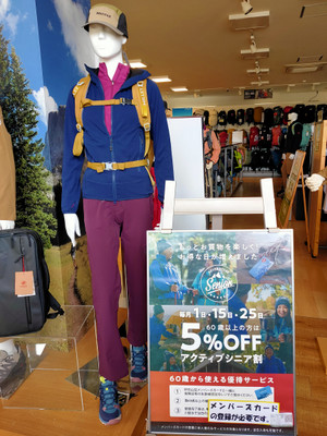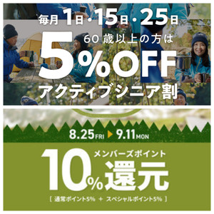 9月1日(金)は『アクティブシニア割』の日 60歳以上の会員様はレジにて5%OFFとお買い得! さらに『初秋アウトドアフェア』開催中につきメンバーズポイントUP
