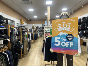 毎週木曜日はレディースデイ! 好日山荘メンバーズ会員様で 女性のお客様は5%OF...