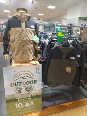 8/25㈮より「初秋アウトドアフェア」を開催いたします!ポイント10%還元に加え、なんとTHE NORTH FACE 商品には8/31までプラス10%ポイント還元を実施するので、なんと20%ポイント還元、プレミアムメンバー会員様は25%のポイント還元となります!そして25日は「アクティブシニアデー」も同時開催するので60歳以上のシニア会員様は5%OFFでお買物もできちゃいます!!とにかくお得な好日山荘へお越し下さい。
