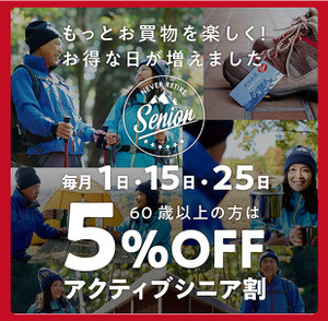 毎月1日、15日、25日はアクティブシニアデー!! 好日山荘メンバーズ会員様で6...