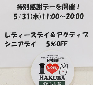 【お知らせ】明日、5月31日(水)は大感謝の『アクティブシニア割』&『レディースデー』&『超ポイント還元祭』開催します