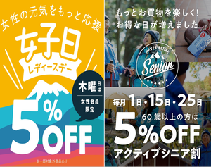 会員限定毎月1日15日25日開催のアクティブシニア割 毎週木曜日開催のレディース...