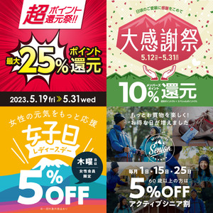 【お知らせ】5月31日(水)は大感謝の『アクティブシニア割』&『レディースデー』&『超ポイント還元祭』開催します