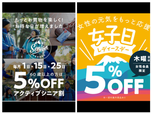 毎週木曜日はレディースデー♪ 好日山荘のメンバーズカードをお持ちのお客様...