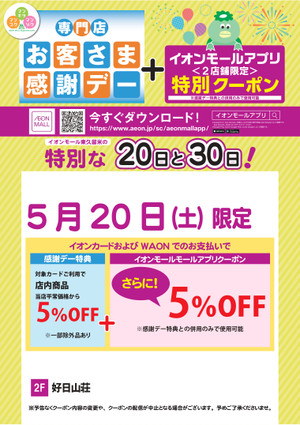 5/20のお客様感謝デーはちょっと違う! イオンモールアプリご提示で10%OFF...