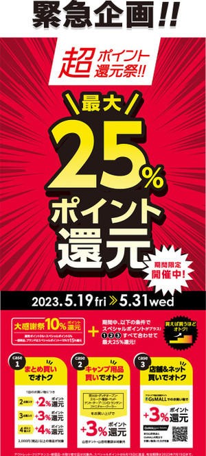 <最大25%還元>超ポイント還元祭スタート!!!<アウトドア>