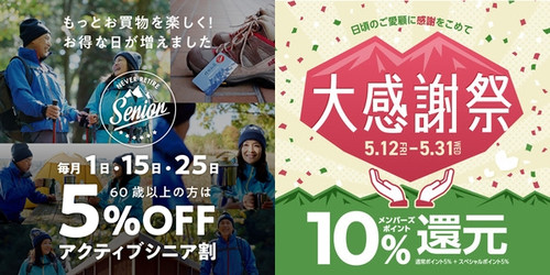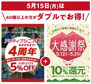 5/15㈪はアクティブシニアデー!絶賛開催中の「大感謝祭」と合わせて60歳以上のシニア会員様は5%OFF高付与ポイントで超お得なスペシャルデーとなります