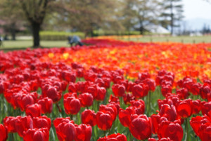 見頃を迎えている長野県大町市の国営アルプスあづみの公園のチューリップと農具川河川...