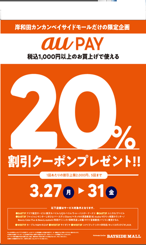 岸和田カンカンベイサイドモール限定のauPAY割引クーポン 【期間】3/27(月...