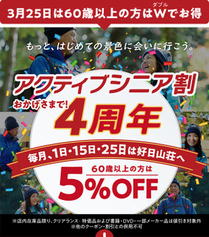 山登りを楽しむ皆さまを、好日山荘は全力で応援したい。 60歳以上の方は毎月1日・...