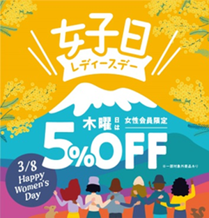 毎週木曜日は『レディースデイ』 女性会員様はレジにて5%OFFとお買い得 さらに『春山応援フェア』開催中につきメンバーズポイントUP