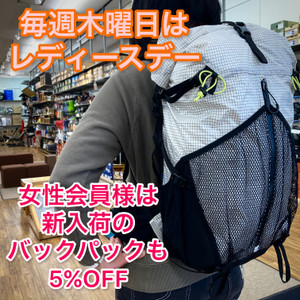 毎週木曜日は『レディースデー』 女性会員様は新入荷のバックパックも5%OFF