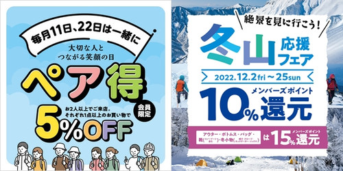 毎月11日は【ペア得】の日 山仲間やご友人・ご夫婦・カップルなど2名様以上でそれぞれお買い物いただくとレジにて5%OFFとお買得 さらにメンバーズポイントUP中
