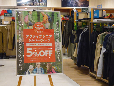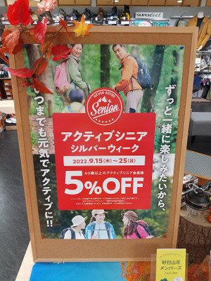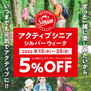 9/15(木)よりアクティブシニアシルバーウィーク開催! 60歳以上のメンバー会員様は9/25㈰まで毎日5%OFFでお買物ができちゃいます!! そして9/15(木)はレディスデーでもあります!女性メンバー会員様も5%OFFでお買物ができますよ~!!敬老の日に向けたプレゼントラッピングも無料で承ります