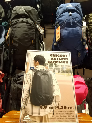 『GREGORY AUTUMN CAMPAIGN』を一昨日9/9から今月末9/30まで実施しております。また靴・バックパック・雨具・ジャケットを購入する際にお得な【リフレッシュ応援フェア】は本日9/11を含めて9/12まで残り二日間ですのでお見逃しなくです。