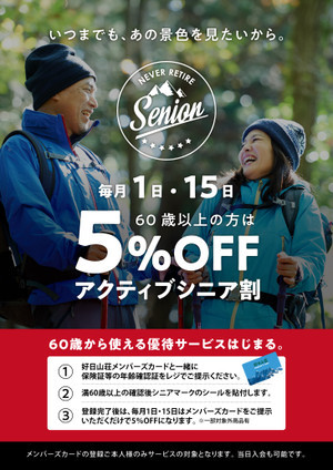 山登りを楽しむ皆さまを、好日山荘は全力で応援したい。 60歳以上の方は毎月1日・...