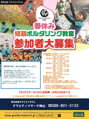 <キッズ向け>春休み短期ボルダリング教室 参加者募集中♪