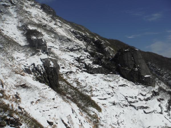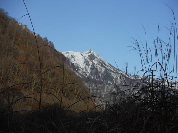 赤い鉄橋を渡って登山口にさしかかると辺り一面ブナの落ち葉で埋め尽くされていました。茶色いほっこり絨毯の上をがさがさと音を立てながら歩くのはこの時期ならではの楽しみです。傾斜がきつくなってくると徐々に雪も付き始め雪山の様相に。登るにつれ左手の一ノ倉沢もせり上がってきて、息が上がって辛くなるとその絶景に励まされました。