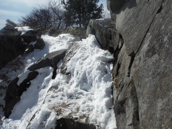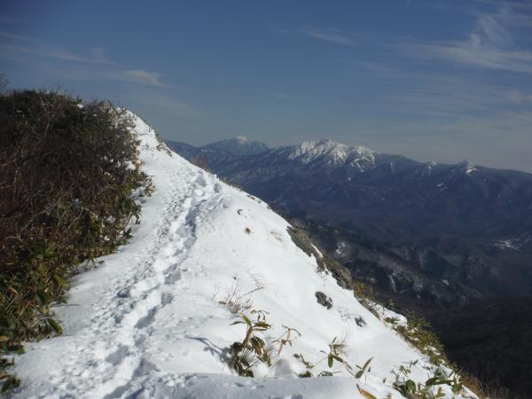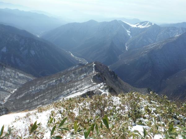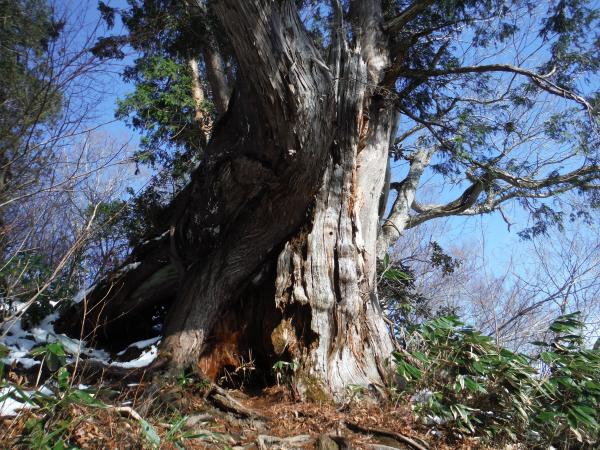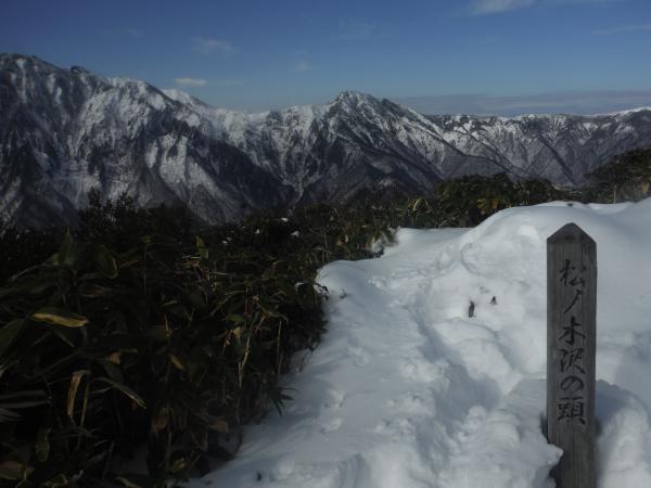 - 登り始めは靴が埋まるくらいのブナの落ち葉の中を歩きます。特に下りは滑り易いです。30分もすると雪が付いてきて、松ノ木沢ノ頭以降はくるぶし以上の高さになりますが、ワカンは使いませんでした。