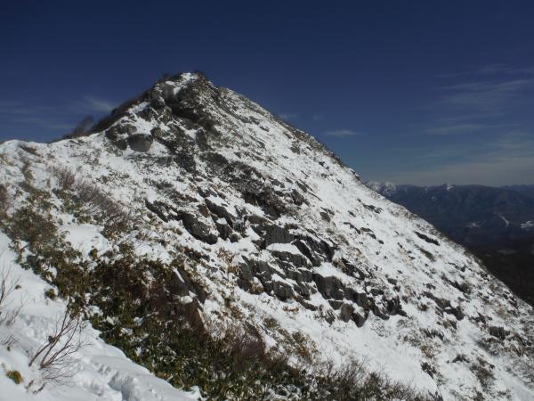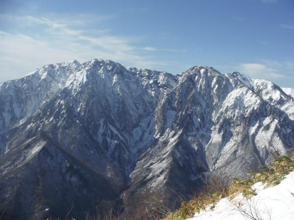 ここまで来ると山頂がいよいよ近づき、この山の所以となったジジ岩、ババ岩も姿を現します。確かに特徴的な形の岩で、雪が付くと白い門のようになるとか。最後の鎖場を越えて山頂に到着すると、今度は前方に三角錐の笠ヶ岳とその縦走路が延びていました。歩いたら本当に気持ちの良さそうな道が続いており、多くの人が縦走したくなる気持ち良くが分かりました。
