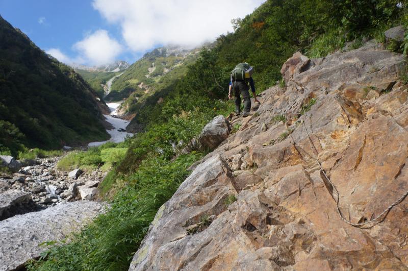 日本三大雪渓のひとつ針ノ木大雪渓は、すでに雪解けが進みノドより手前までしか雪渓上は歩けませんでした。高巻ルートは急な登り且つ岩がごろごろしていて登りづらかったです。