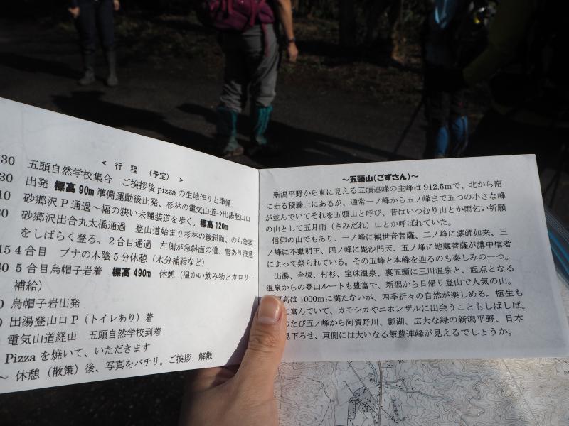 - 五頭自然学校(40分)出湯登山口(60分)4合目(15分)烏帽子岩(60分)出湯登山口(40分)五頭自然学校