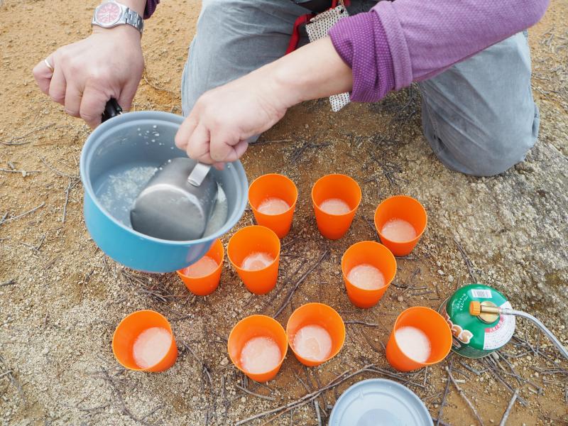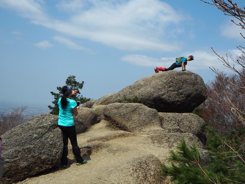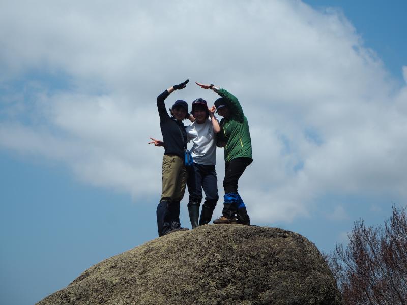 この日のゴールの烏帽子岩では岩に攀じ登り、思い思いのポーズで撮影。涼しい風が吹き抜け肌寒かったので暖かい甘酒を振る舞わせていただきました。そろそろお腹が空く時間、ピザを目指して元気に下山しました。
