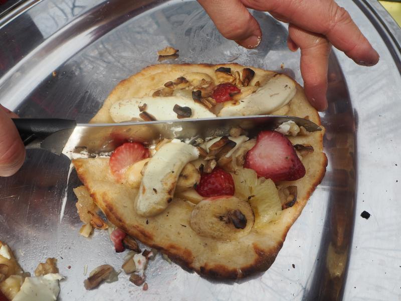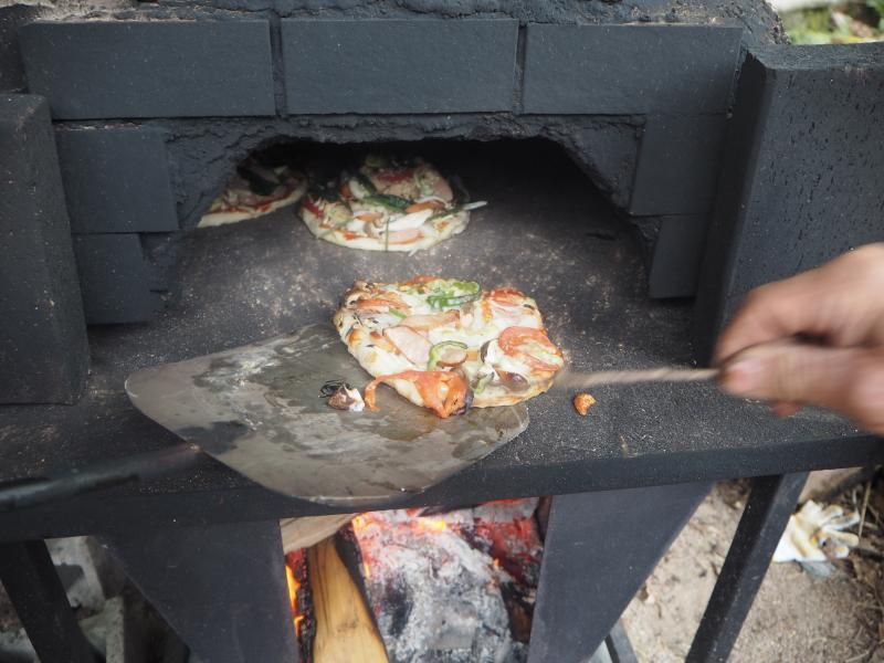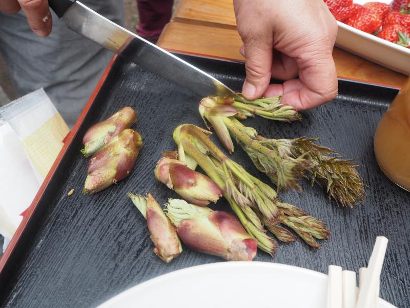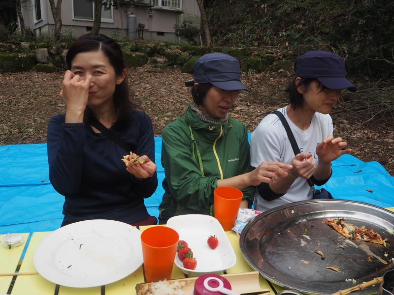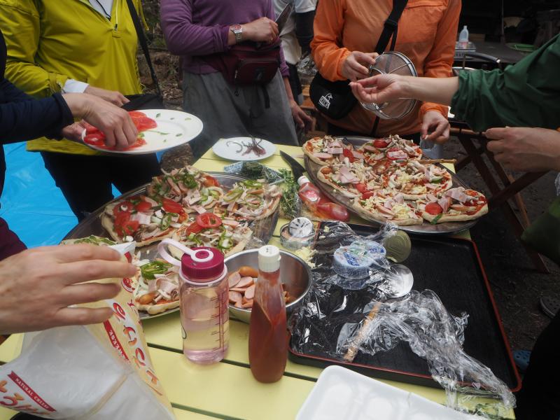 自然学校に戻るとスタッフの方々が後はピザを焼くだけ、の状態にセッティングしてくれていました。ピザだけではなく、燻製ウインナーや竹筒ご飯、焼き芋まで!採れたてのタラの芽はピザのトッピングに追加、自家製さるなしのジャムなどもフルーツピザのトッピングに加えました。焼きたてのピザを頬張り皆さん笑顔がこぼれます。山の話などもして盛り上がっていました!