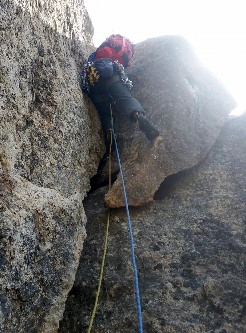 一旦ルンゼを下り、ハング下をトラバース。ちょうどダルマのクビレのとこですね(^v^)