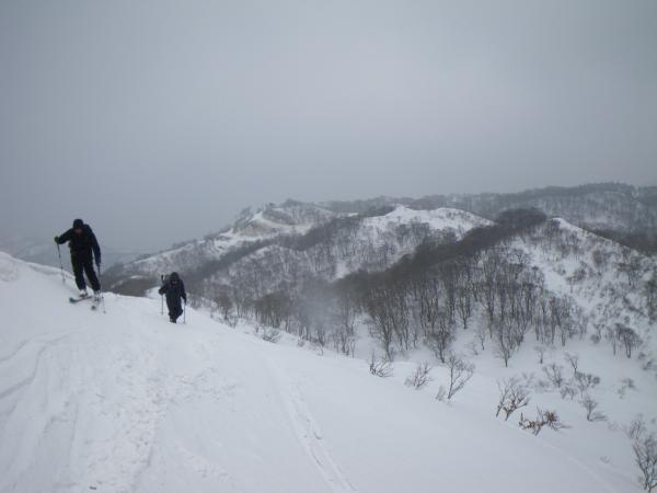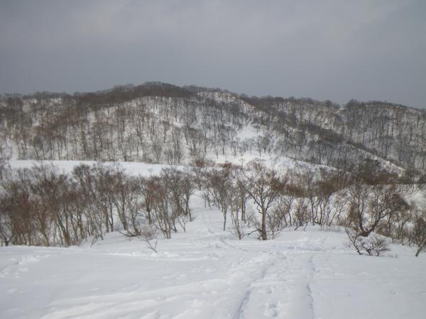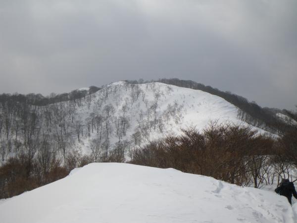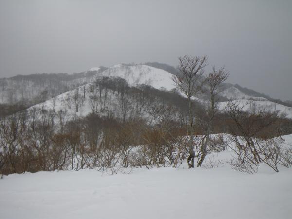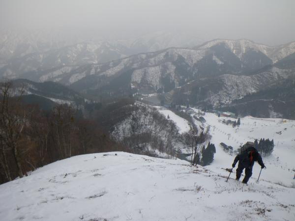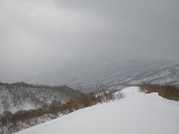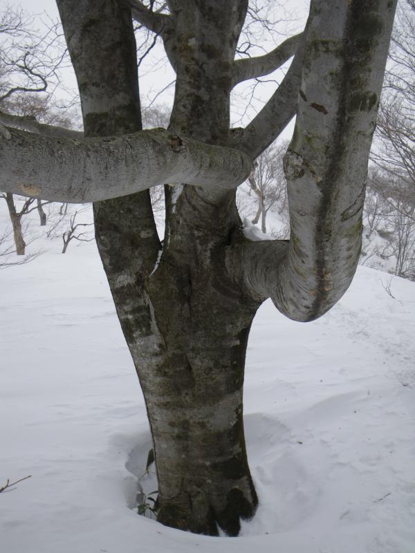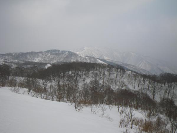 奥伊吹スキー場から登る山で、どちらかというと山スキーで行く山かも知れません。ルートは若竹荘の裏から沢を超えて、直接、山頂に出るルートが一般的のようです。ちなみにこのルートは夏道で若竹荘の方が作った道だそうです。今回は途中まではそのルートを行こうとしましたが、わかりにくそうなのでそのままスキー場横の尾根をスキー場沿いに稜線まで上がりました。稜線に上がっても、スキー場の敷地のように広い尾根が続く稜線で、山頂ものっぺりした感じです。山頂からは本来、琵琶湖や伊吹山や奥美濃の山が360°見えるはずですが、今日は霞んでいました。帰りに伊吹山が見えましたが、表からはあまりなさそうですが、裏を見れば雪はしっかりありました。このあたりの奥の山は4月までは雪が残るほどあります。