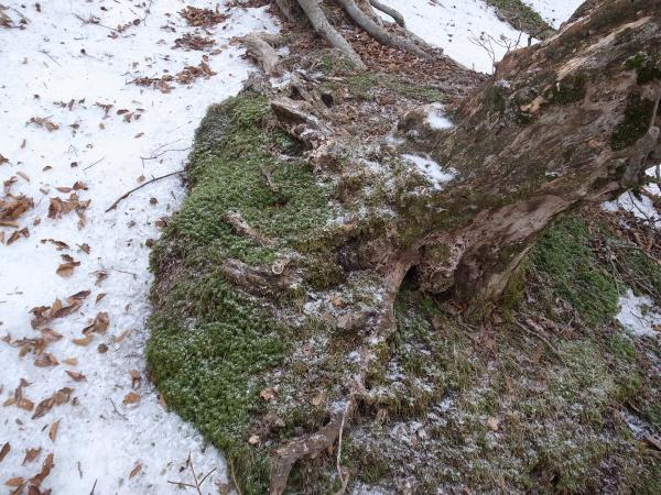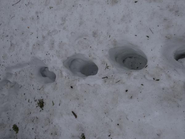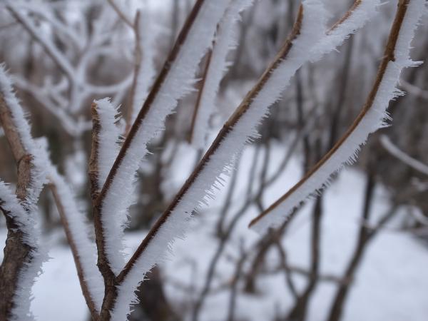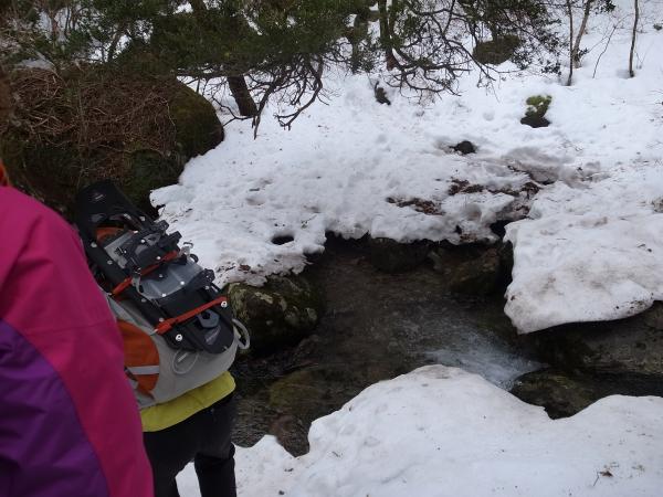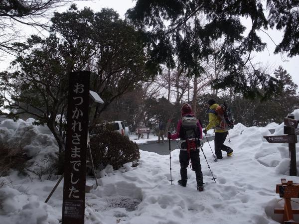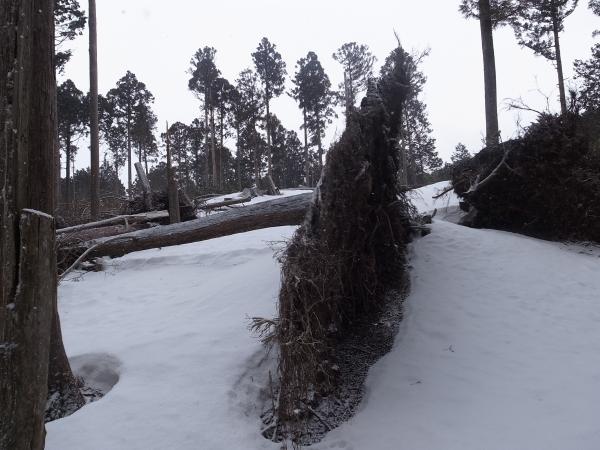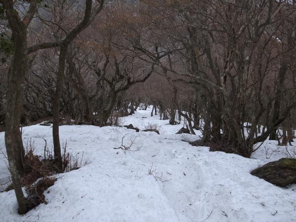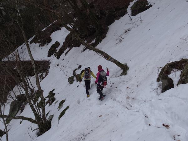 - 登山口から積雪あり。前日の雨の後冷え込んだので雪が固く、時々ひざや腰くらいまではまりました。