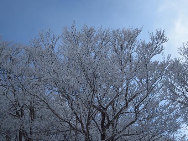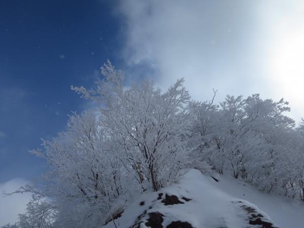 1420mの車道との合流地点で尾根に登り上げると丁度青空になっていて初めて白木峰(※)が見えて嬉しくなる。