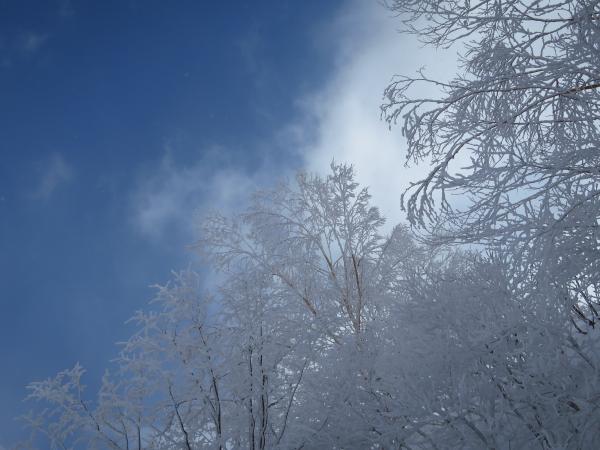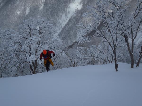 稀に急で氷化している際どい斜面もあったが、枝等使える物は使って登り上げる。
