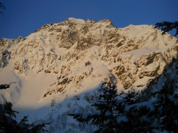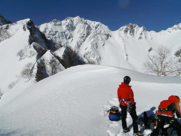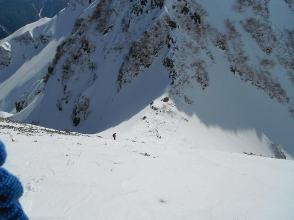 積雪が予想していたよりも少なく、岩場と雪斜面のトラバースとなった。奥明神沢を下山したくなるが、雪崩が心配になった。明神2峰は左の凸角から突破。自分の場合、夏に右側からまいたが行けそうになかった。