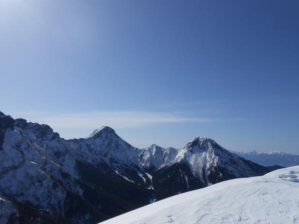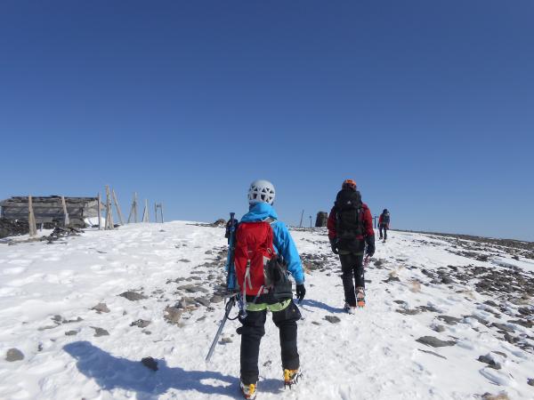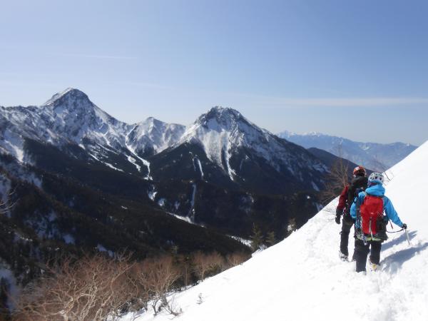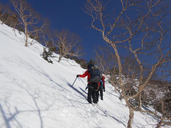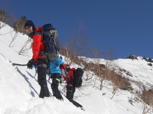 赤岳鉱泉から硫黄岳は、途中からはトラバースになりなかなかスリルがありますので、ピッケルを使い慎重に進む必要があります。