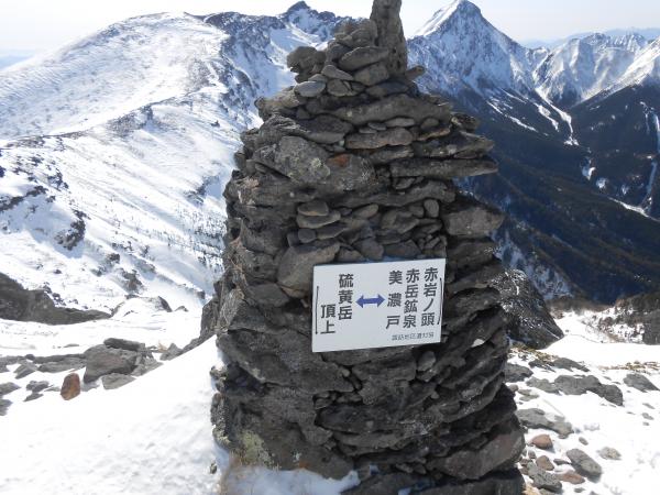 硫黄岳までの登りは、トラバースもありなかなかスリルもありました。今回は風もなくのんびりと登山を楽しめましたが、普段は稜線上は風が強く、しっかり耐風姿勢を取らないと、去年大荒れの中登った経験のある同行者が、「風で体が浮いた。」との話にびっくりしました。