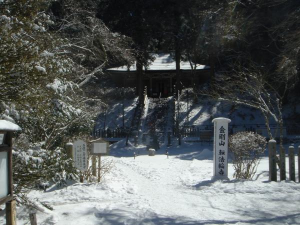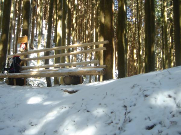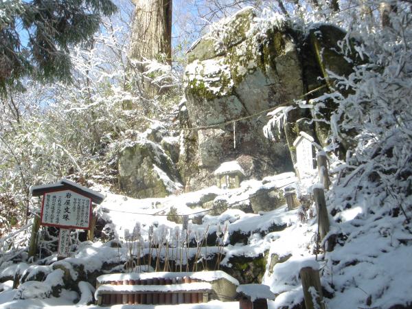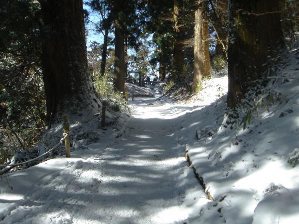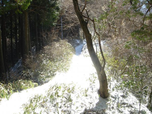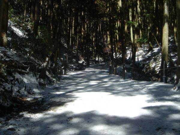 ここ何日かの寒気の流れ込みで登山口近くから積雪が復活。中腹部で約5~6㎝、山頂部で約10㎝ほど。日向部分以外は、割とサラサラの雪で路面も冬シーズン同様の圧雪路。北面の一部ではわずかですが樹氷も見られました。