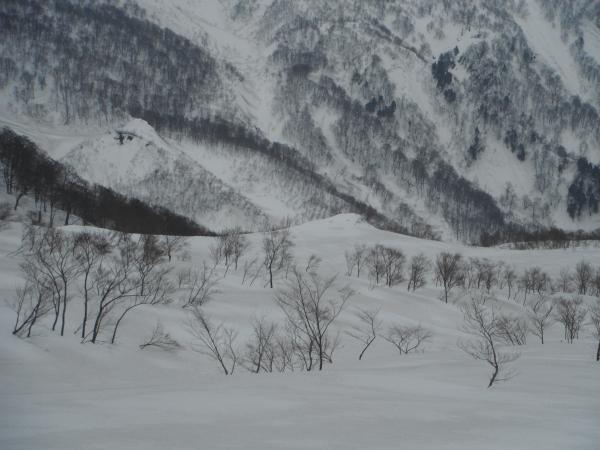 猿倉~二股は雪が繋がっているが板が全く走らない。