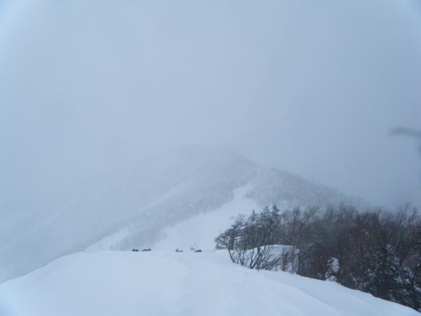 運悪くこの日はガスと急風の稜線歩き、コースの幅も広く雪庇も長く張り出しているので大変でした。短時間のホワイトアウトが繰り返しあり、ゆっくりですが確実に進んでいきます。GPSにも助けられました。