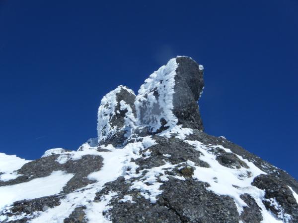 - 前三ツ頭までは樹林帯なので危険箇所なし。そこより稜線に上がるので視界不良などルート失に注意です。当日も強風とガスの中ホワイトアウト。コルの樹林帯に入るまではルートファインディングでした。