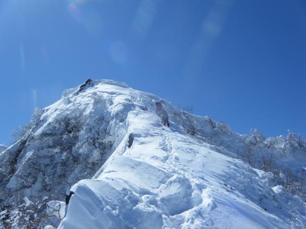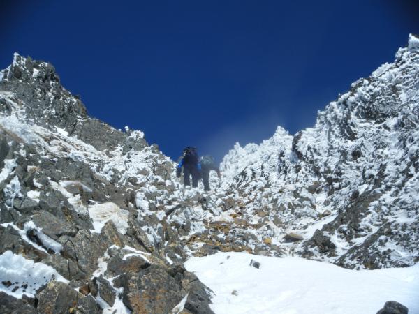 そこから先が本格的な冬山の感じ。随分と慣れましたがやはり一歩踏み出すのには勇気がいります。アイゼンの緩み具合やバラクラバ、ザックの背負い間の調整など道具の再点検をし、自分に気合いを入れます。