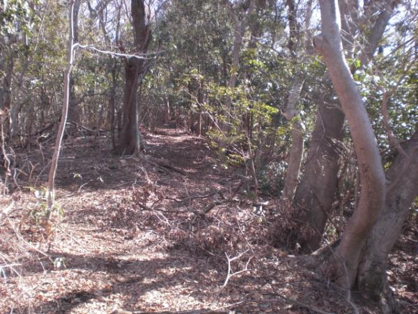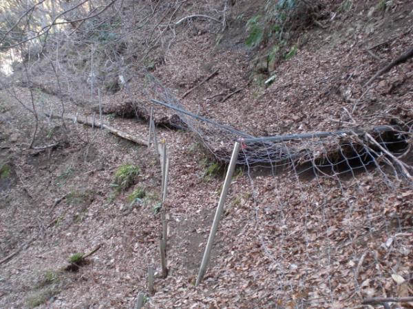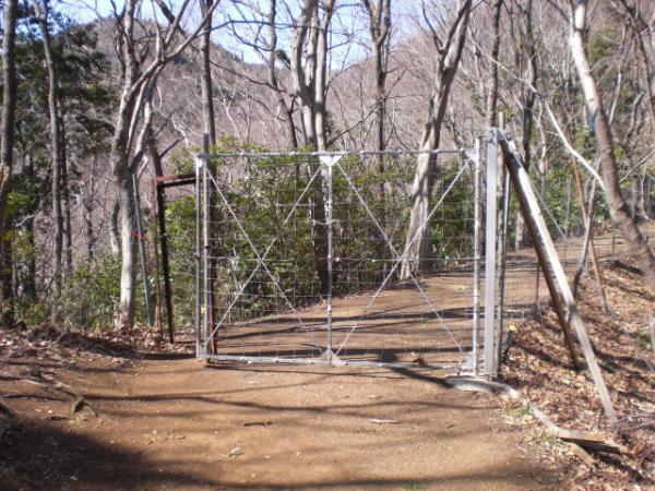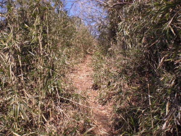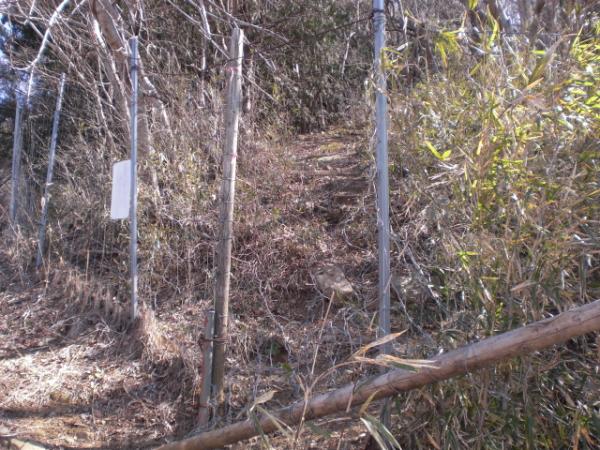 低山らしい笹藪を抜けると、今度はすぐ右に柵を破ったような入口があります。