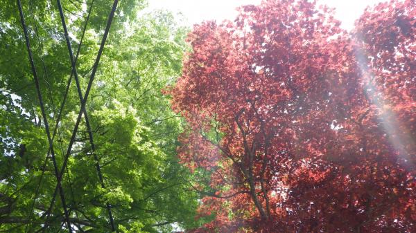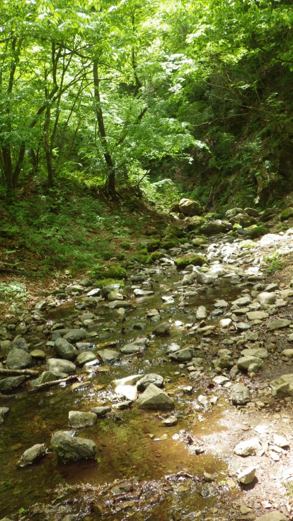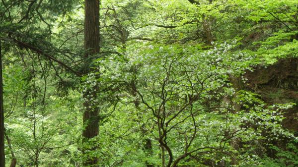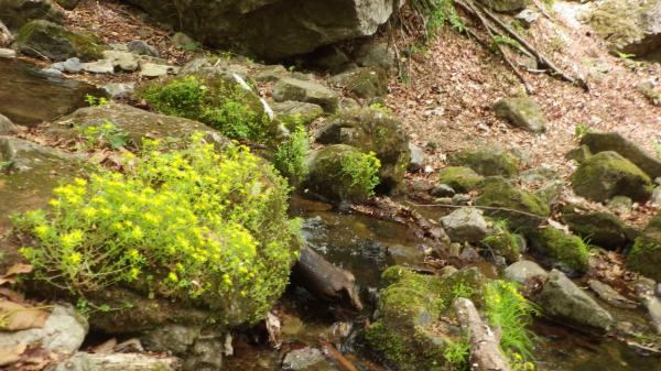木々に若葉が茂り、水辺の石には苔も生えていて、緑が深いです。