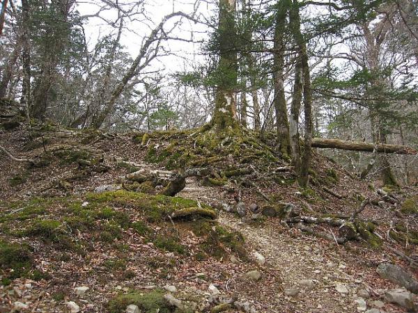 コースは北側のルートが1/25000の地形図に描かれた登山道と異なります(GPSの軌跡で確認)。迷いやすい所にはロープが張られているので注意して進めば問題ないと思いますが、コンパスや地形図、登山地図は必ず携行してください。開拓分岐から逆峠に向かう道も地形図と少し異なるようです。