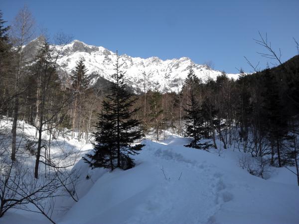 行者小屋のテント場を回り込んですぐに、林に沿って謎のトレースがありますが無視して、沢に沿って右へ。10分程歩くと少し開けた中州に文三郎尾根と阿弥陀岳への分岐がありますので、ここは左へ。雪に隠れてルートが分かりにくくなっていますので、道迷いに注意しましょう。