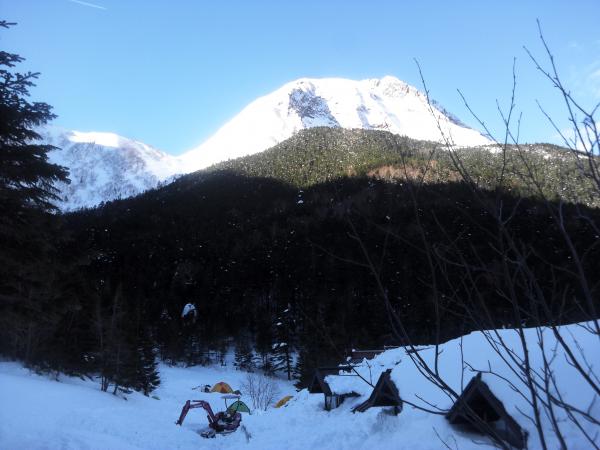 2日目の朝も風は少しあるものの快晴で、雪を纏った赤岳、横岳、硫黄岳が青空にくっきりと浮かび上がっていました。