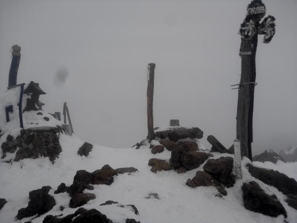 赤岳には登頂出来ましたが展望はなく、ガスに覆われ視程は2メートルほど、身体が煽られる強風となり、更にどんどん悪くなって行くのを感じました。