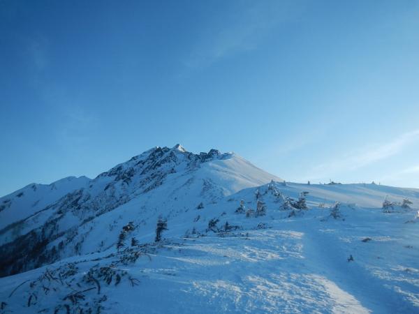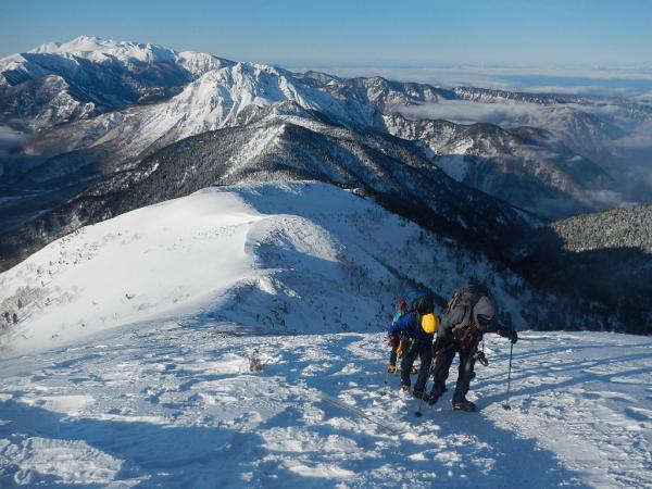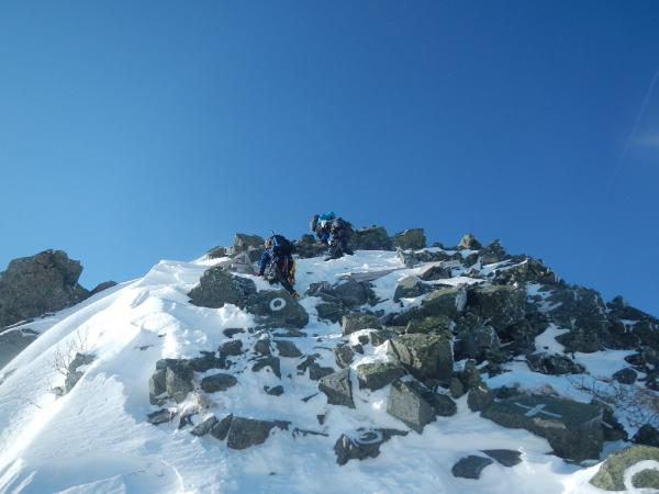 気になる積雪も大したことはなく、稜線は風で飛ばされて前日までのトレースがしっかりと確認できる状態。