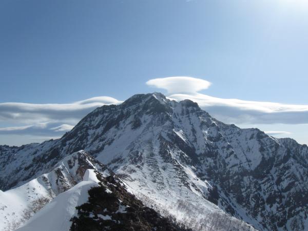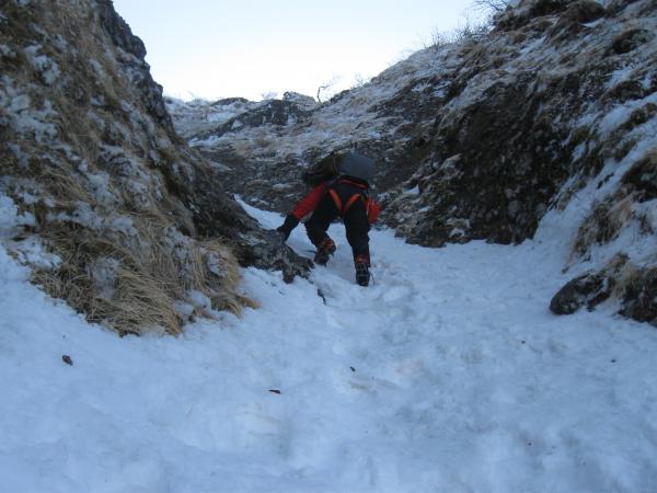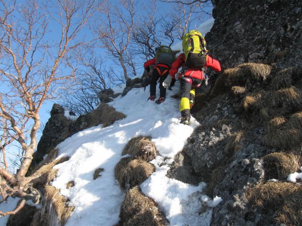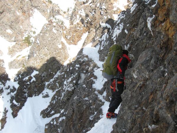 今回のルートの核心部となるP3ルンゼは雪の条件が良く、ザイルを出さずに通過できました。
