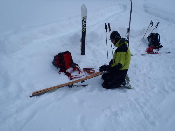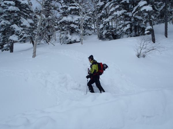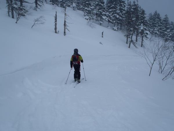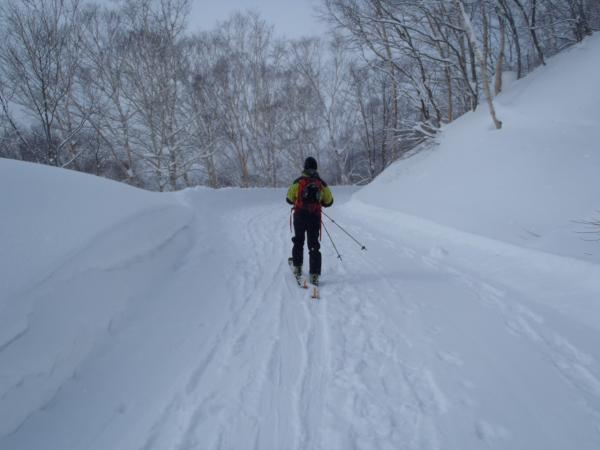 ここからラッセルで登っていくことを考えると時間的にも厳しく、そこからリルートで下ることを決断。